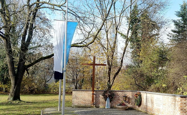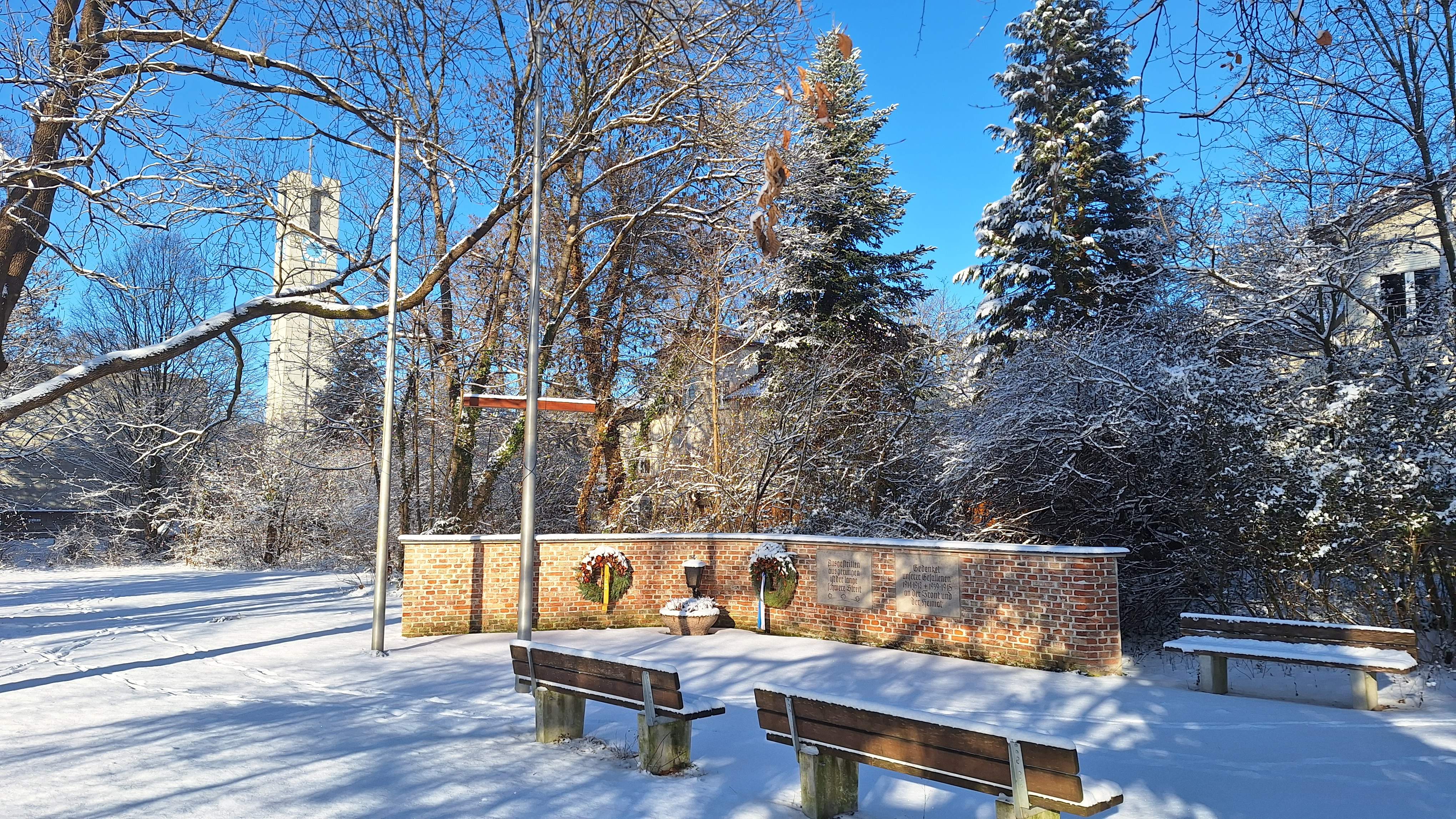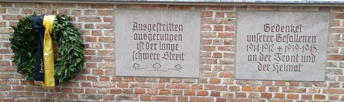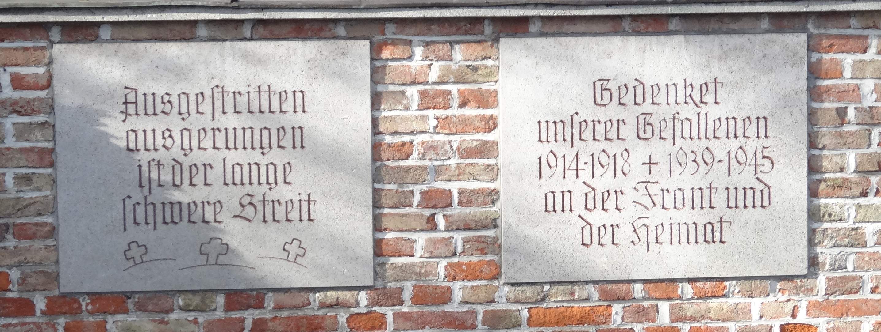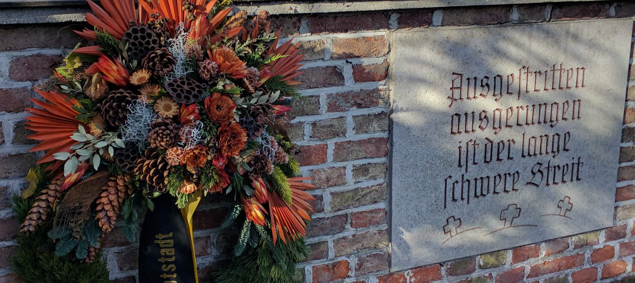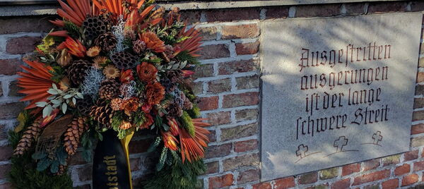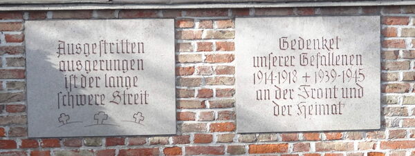 Das Ehrenmal wurde aus Steinen von kriegszerstörten Häusern errichtet. Es mahnt zu Frieden und Versöhnung